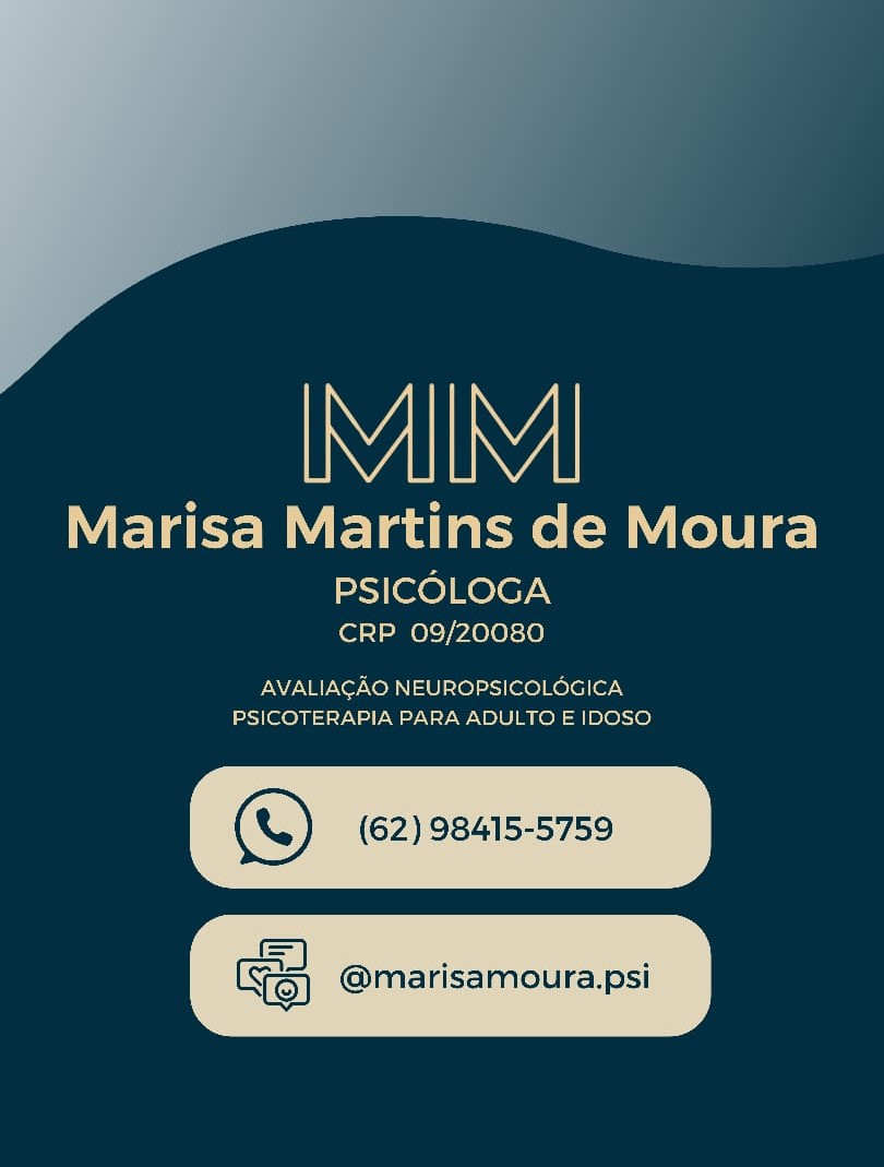 Olá, sou a Marisa Moura (CRP 09/20080) atuo como Neuropsicóloga e Psicóloga Clínica, sou graduada em Psicologia & RH, Especialista em Avaliação Psicológica e Neuropsicologia, Especialista em Psicologia do Trânsito, Psicóloga de Trânsito credenciada ao Detran-GO, Consultora de Bem-Estar do SESI GO.